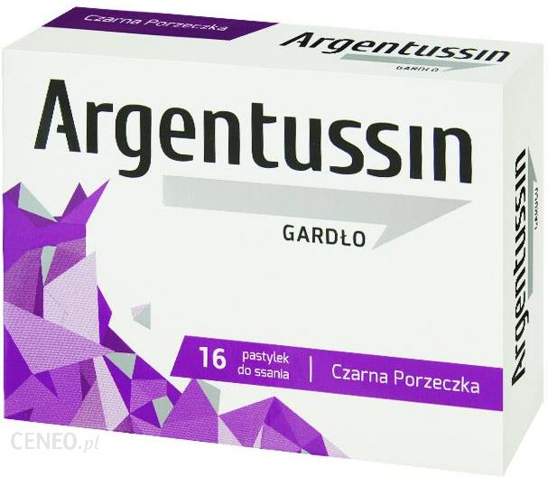 Wyrób medyczny leczniczyPodczas ssania pastylek Argentussin gardło, uwalniane są substancje czynne, które powlekają błonę śluzową gardła i jamy ustnej ochronnym filmem. Preparat wspomaga leczenie stanów zapalnych gardła spowodowanych przez infekcje bakteryjne i wirusowe. Dzięki zawartości mentolu, Argentussin gardło łagodzi objawy zapalenia takie jak ból i pieczenie.Zastosowanie: leczenie stanów zapalnych gardła.Dawkowanie: 1 pastylka do ssania w zależności od potrzeb kilka razy dziennie. Nie należy przekraczać zalecanej porcji do spożycia w ciągu dnia.Składniki: wodny wyciąg z porostu islandzkiego, nanokoloid srebra, kwas cytrynowy, cukier, syrop glukozowy, aromat: czarna porzeczka, mentol, koszenila, woda.Przeciwwskazania: nadwrażliwość na którykolwiek ze składników preparatu. Nie stosować u osób ze stwierdzoną alergią na srebro metaliczne.Ważne wskazówki:Pastylki można stosować przez dłuższy okres czasu, jednak w przypadku braku poprawy należy zasięgnąć porady lekarza.Przechowywać w temperaturze pokojowej.Przechowywać w miejscu niedostępnym dla małych dzieci.Producent:Solinea,Elizówka 65, Hala I,21-003 Ciecierzyn.