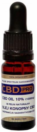 CBD Pro olejek konopny 10% 1000mgOlejki CBD Pro otrzymywane są w procesie nadkrytycznej ekstrakcji CO2 (najlepsza metoda) i zawierają pełne spektrum kannabinoidówPojemność 10ml (około 185 kropli)1 kropla zawiera około 5,4mg CBD. Ilość CBD potwierdzona certyfikatami. Zawiera mniej niż 0,2% THC