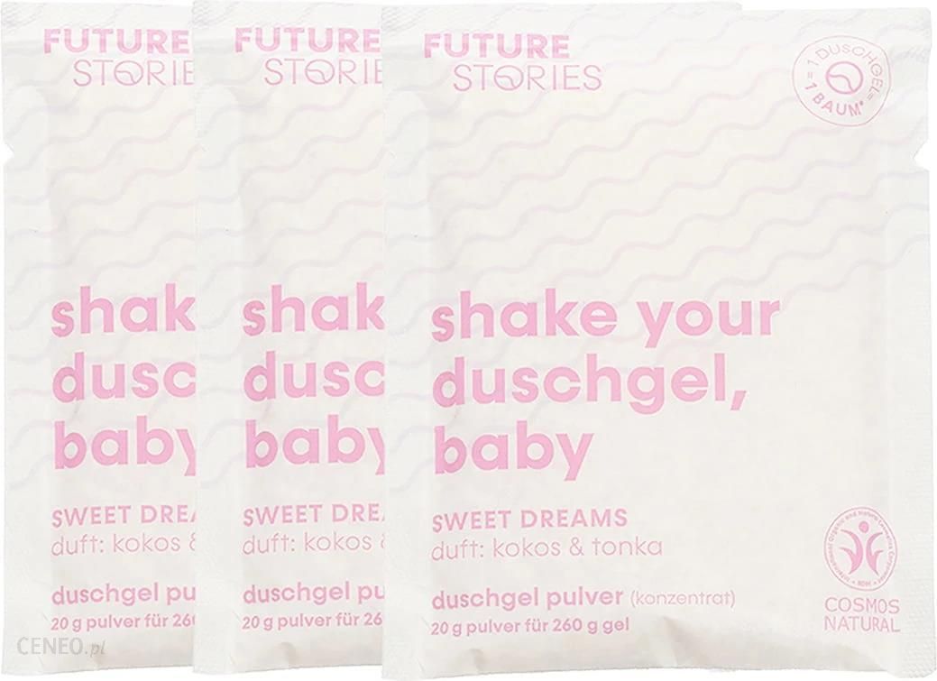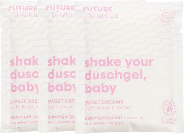 Ciepły zapach kokosu i fasoli tonka Ten certyfikowany proszek nie tylko zamienia się w pielęgnujący i oczyszczający żel pod prysznic, ale wspaniale sprawdza się na skórze. Delikatna piana rozpieści ciało i pozostawia na niej przyjemny, zmysłowy zapach. Konsystencja jest przyjazna dla środowiska, a opakowanie kompostowalne, to sprawia, że cały produkt jest przyjazny dla środowiska i używając go zmniejszamy zużycie plastikowych opakowań. Z opakowania o pojemności 20 g zrobisz 260 ml żelu pod prysznic. Instrukcja: Wlać 240 ml letniej wody do dozownika z pompką FUTURE STORIES. Szybko dodać żel pod prysznic w proszku. Natychmiast energicznie potrząsnąć 10 razy. Odstawić na co najmniej 15 minut. Ponownie potrząsnąć. Uwaga: Przez zawarty w żelu naturalny olejek waniliowy produkt może zabarwić się na brązowo. Żel pod prysznic należy zużyć w ciągu 3 miesięcy od wymieszania go z wodą.