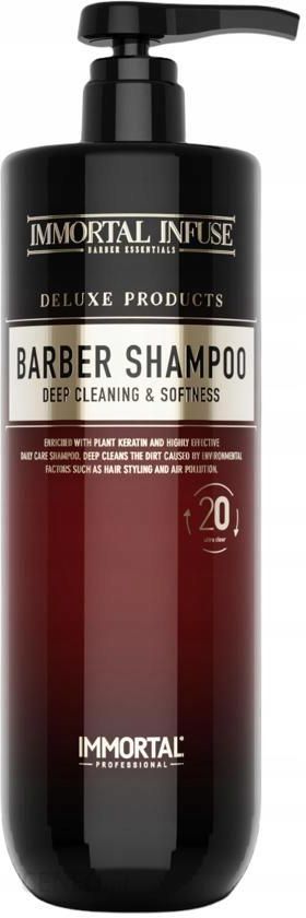 Immortal Barber Shampoo Szampon do włosów – 1000mlImmortal Barber Shampoo – 1000mlDoskonały szampon nawilżająco-oczyszczający włosy z keratyną.Doskonały szampon nawilżająco-oczyszczający włosy z keratyną. Dzięki zawartej w nim keratynie roślinnej zatrzymuje wilgoć we włosach i zapewnia im jedwabistą miękkość i połysk. Głęboko oczyszcza włosy i skórę głowy zapewniając efekt odświeżający. Ułatwia rozczesywanie włosów. Zapewnia ochronę przed uszkodzeniem spowodowanym użyciem ciepłego powietrza przy stylizacji grzebieniem lub szczotką. Nie obciąża i przeciwdziała elektryzowaniu się włosów. Odpowiedni do wszystkich rodzajów włosów. Nadaje się do codziennego użytku.Butelka z pompką dozującą zapewnia wygodną i wydajną aplikację produktu.Pojemność: 1000ml