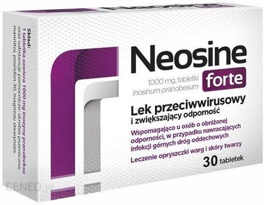 Neosine forte to lek o działaniu przeciwwirusowym oraz immunostymulującym. Produkt leczniczy zawiera podwójną1 dawkę substancji czynnej inozyny pranobeks w jednej tabletce i jest dostępny bez recepty. Polecany jest wspomagająco dla osób o obniżonej odporności, w przypadku nawracających infekcji górnych dróg oddechowych. Dodatkowo, inozyna hamuje namnażanie chorobotwórczych dla człowieka wirusów z grupy Herpes, wywołujących opryszczkę warg i skóry twarzy.Wskazania: zakażenia skóry i błon śluzowych wywołane przez wirus opryszczki zwykłej typu I (opryszczka wargowa) lub typu II (opryszczka okolicy płciowej) oraz ospy wietrznej i półpaśca; inne zakażenia wywołane przez wirusy (np. podostre stwardniające zapalenie mózgu, będące powikłaniem odry); wspomagająco u osób o obniżonej odporności, w przypadku nawracających infekcji górnych dróg oddechowych.